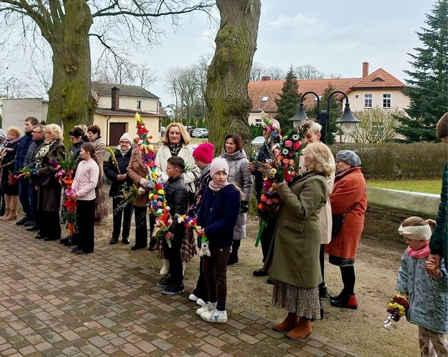 Po nabożeństwie, dyrektor Gminnego Ośrodka Kultury, Pani Iwona Biniak oraz proboszcz Witold Korowajczyk wręczyli nagrody zwycięzcom konkursu na najpiękniejszą palmę wielkanocną. Wyróżniono zarówno prace indywidualne, jak i grupowe, doceniając pomysłowość, estetykę oraz nawiązanie do tradycji.