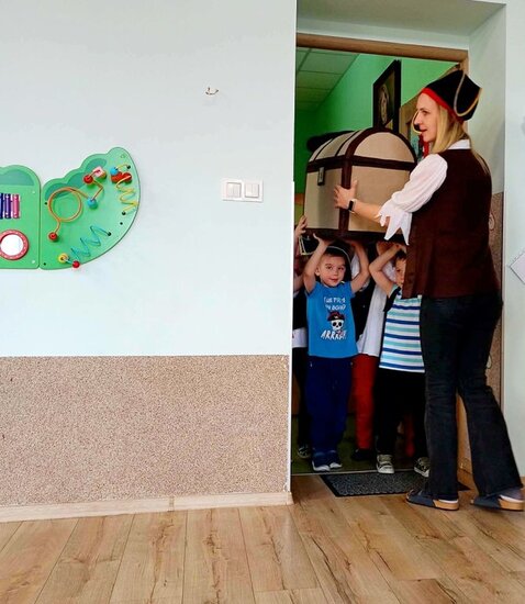 Następnie sprawnie uciekliśmy po kamieniach przed głodnymi krokodylami i odważnie przedarliśmy się przez niebezpieczną dżunglę. Nie zabrakło również wspólnego pirackiego tańca. Na koniec udało nam się przejść przez most linowy i po starciu ze strażnikiem zdobyliśmy upragniony skarb. W wielkim kufrze dzieci znalazły nowe gry dla swoich grup, złote monety oraz list, który specjalnie dla nich zostawiła Pani Wiosna.