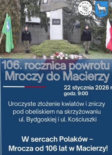 Uroczystość upamiętniająca 106. rocznicę powrotu #Mroczy do Macierzy odbędzie się 22 stycznia 2026 roku o godz. 9:00.