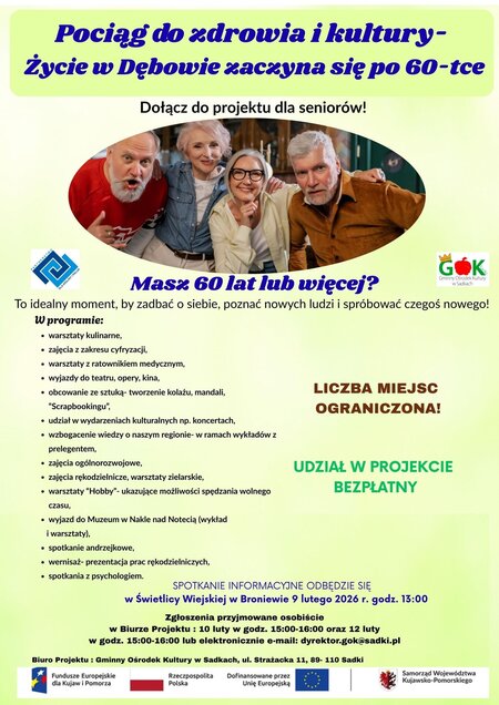 Gminny Ośrodek Kultury w Sadkach zaprasza seniorów z powiatu nakielskiego do udziału w projekcie objętym grantem pt. POCIĄG DO ZDROWIA I KULTURY- Życie w Dębowie zaczyna się po 60-tce, w ramach którego utworzony zostanie klub seniora dla osób 60+.