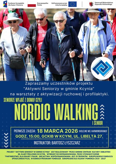 Zapraszamy uczestników projektu# "Aktywni Seniorzy w gminie Kcynia" na warsztaty z aktywizacji ruchowej i profilaktyki "Seniorze wyjdź z domu! Czyli Nordic Walking i senior."