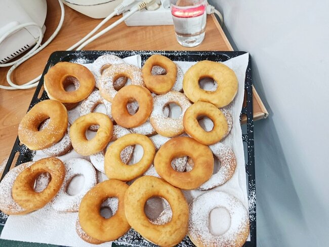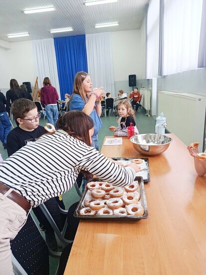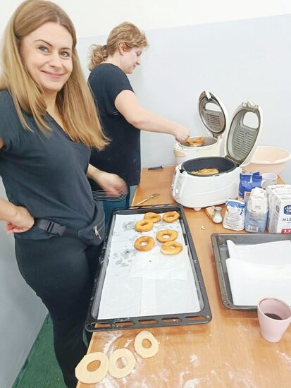 Pierwszą część zajęć wypełniły warsztaty plastyczne, podczas których powstawały kolorowe prace z motywem pączka. Dzieci wykazały się ogromną pomysłowością, wykorzystując różnorodne materiały: plastelinę, kolorowe druciki kreatywne, krepę, pisaki oraz inne ozdoby. Każda praca była wyjątkowa i pełna barw, a wspólne tworzenie sprawiło uczestnikom wiele radości. Największą atrakcją dnia była jednak wizyta Mam, które przygotowały dla dzieci prawdziwą kulinarną niespodziankę – domowe oponki. Co więcej, dzieci mogły aktywnie włączyć się w ich przygotowanie. Z ogromnym zaangażowaniem wycinały kształty z ciasta, a po usmażeniu z radością obsypywały je cukrem pudrem. Wspólne pieczenie było nie tylko świetną zabawą, ale także doskonałą okazją do nauki współpracy i poznania tradycyjnych przepisów. Na zakończenie wszyscy zasiedli do wspólnej degustacji świeżutkich oponek. Słodki poczęstunek smakował wyjątkowo – w końcu był efektem wspólnej pracy. Nie zabrakło też zabaw ruchowych, które pozwoliły spożytkować energię i wprowadziły jeszcze więcej uśmiechu na twarzach dzieci.