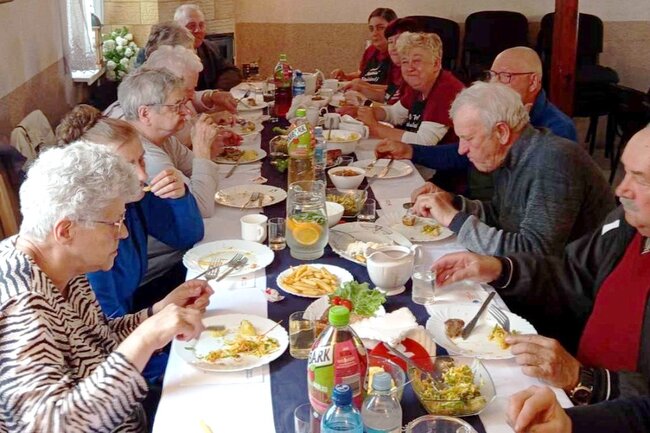 Na dzisiejszym spotkaniu zaserwowaliśmy pyszny rosół z zieloną pietruszką oraz swojski chleb z masłem czosnkowym. Następnie Panie podały potrawkę z ryżu, gotowane pałki z kurczaka polane białym sosem oraz marchewkę z groszkiem na słodko. Kolejną pysznością tego spotkania były 3 rodzaje mięs a konkretnie : dewolaje z masłem i z serem , klopsy mielone z pieczarkami oraz roladki typu zraz. Dodatkiem były ziemniaki z koperkiem, frytki oraz półksiężyce. Na stole pojawiły się dodatkowo odświeżające surówki, które dodawały lekkości posiłkowi.