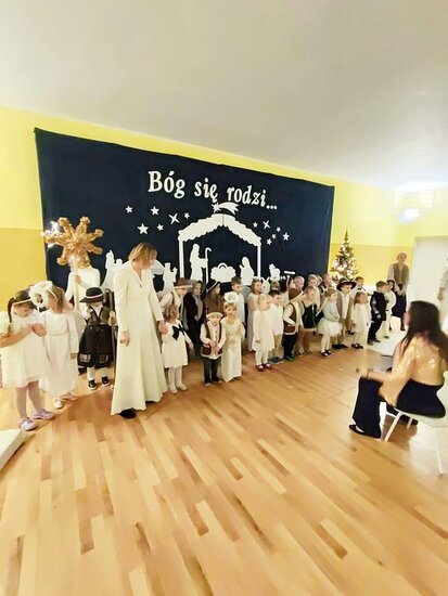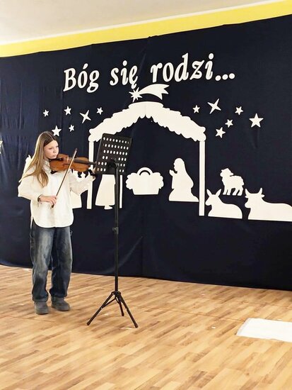 Dzieci z grupy "Sowy" i "Zajączki" z ogromnym zaangażowaniem zaprezentowały świąteczny program artystyczny, wprowadzając wszystkich w wyjątkowy, bożonarodzeniowy nastrój. Podczas jasełek mieliśmy przyjemność wysłuchać pięknego występu Igi Pstrągowskiej, która zagrała na skrzypcach. Jej występ był prawdziwą ozdobą naszych jasełek.