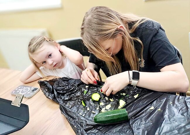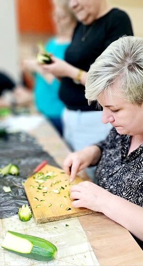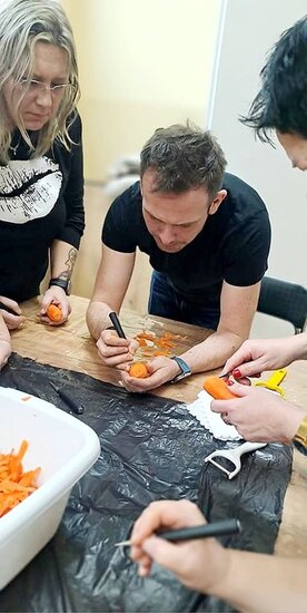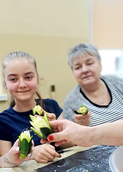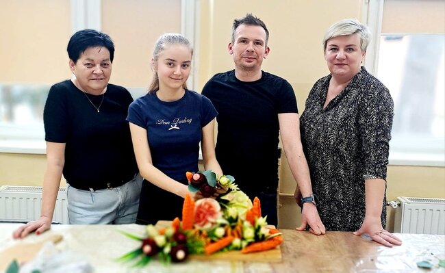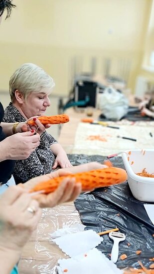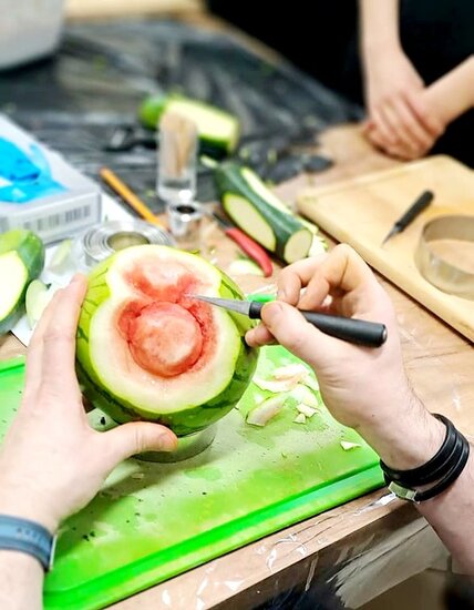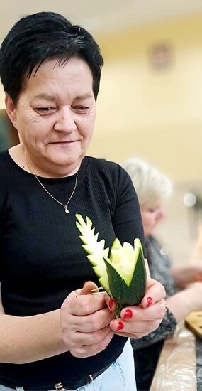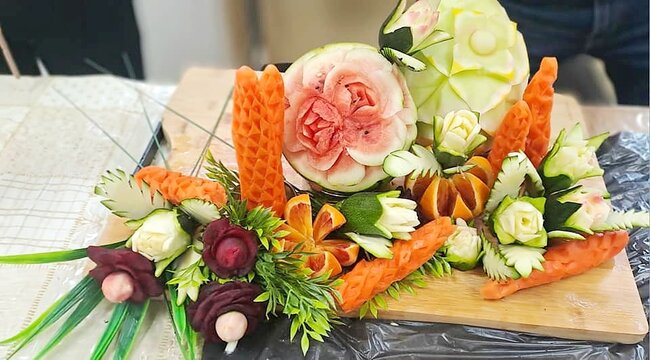 Ale to nie wszystko! Po emocjonującej rozmowie przeszliśmy do części praktycznej – szkolenia z carvingu. Efektem naszej pracy była przepiękna kompozycja z owoców i warzyw, która zachwyciła wszystkich uczestników.