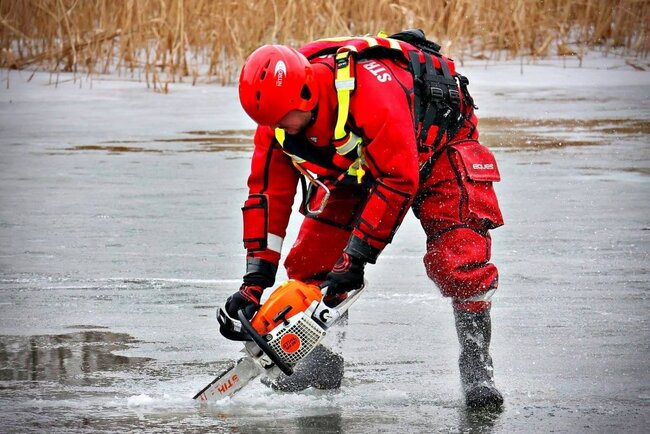 Praca na lodzie: Strażacy co kilka metrów wycinają otwory w pokrywie lodowej przy użyciu pił spalinowych. Dzięki temu nasi ratownicy mogą wprowadzać sonary i dokładnie przeszukiwać dno rzeki.