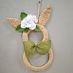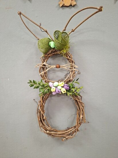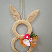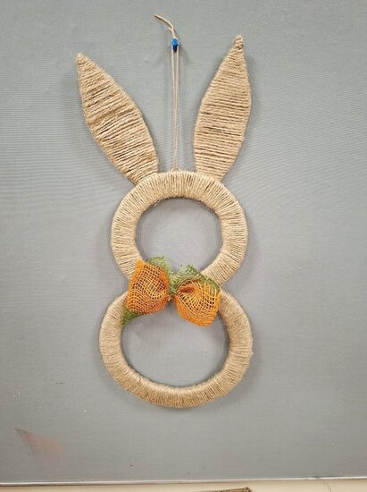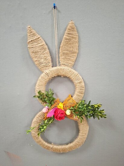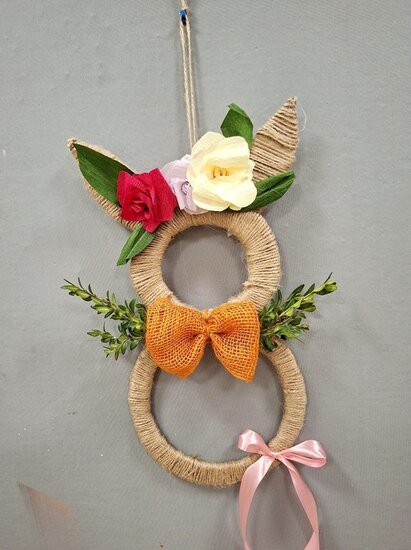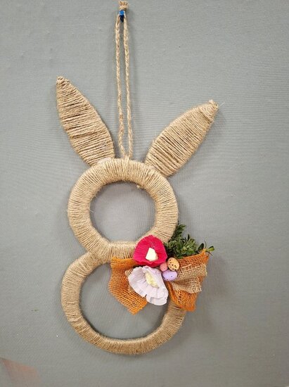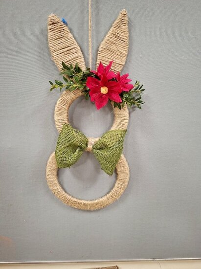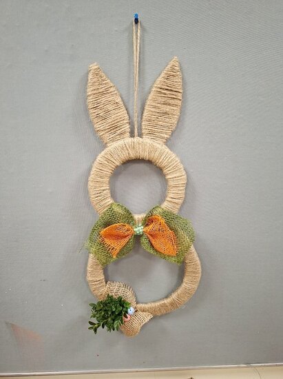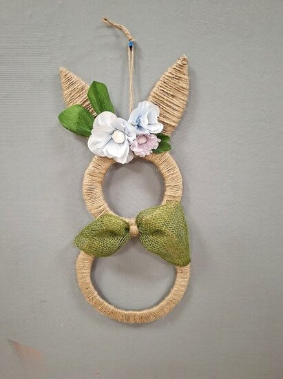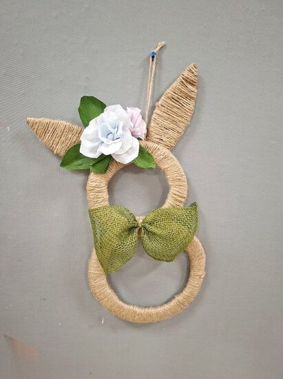 Z tektury i sznurka jutowego powstały wyjątkowe zawieszki w kształcie zajączka. Uczestnicy ozdabiali je kwiatkami, które samodzielnie wykonali z krepiny. Kokardy z juty ,wstążki oraz kolorowe jajeczka pięknie dopełniły nasze prace.