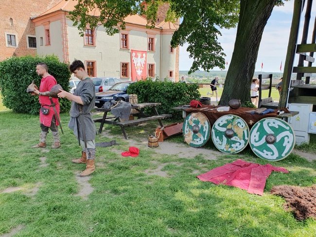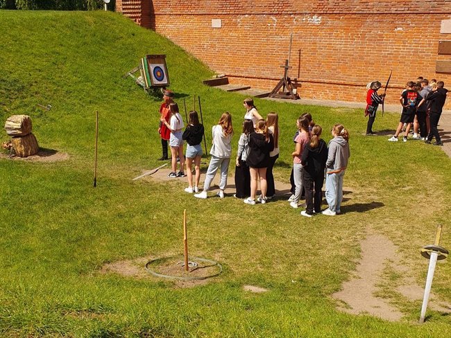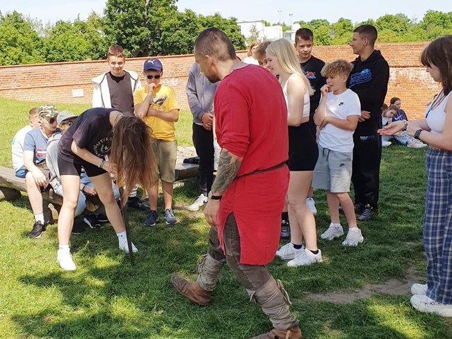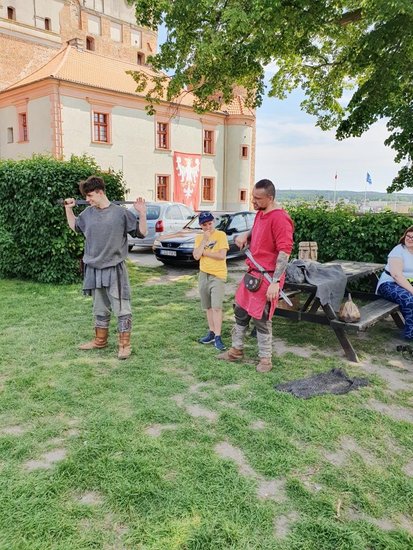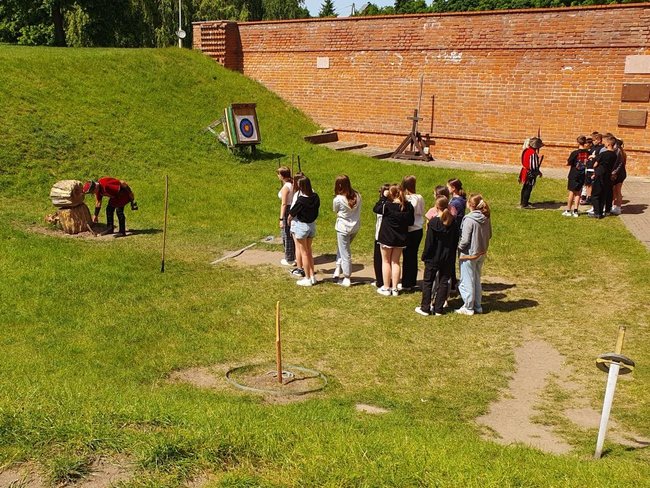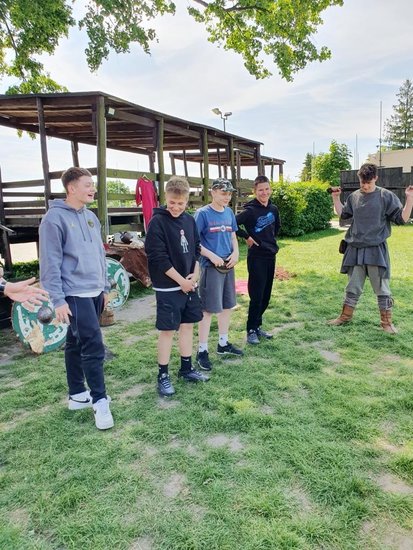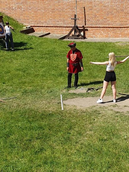 Podzieleni na grupy uczestniczyliśmy również w warsztatach strzelania z łuku, rzut toporem, włócznią oraz podkową.