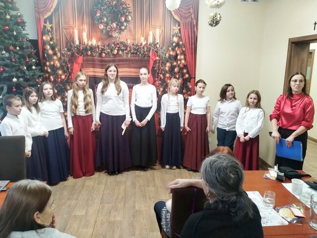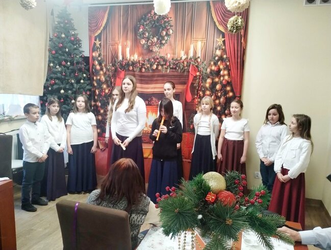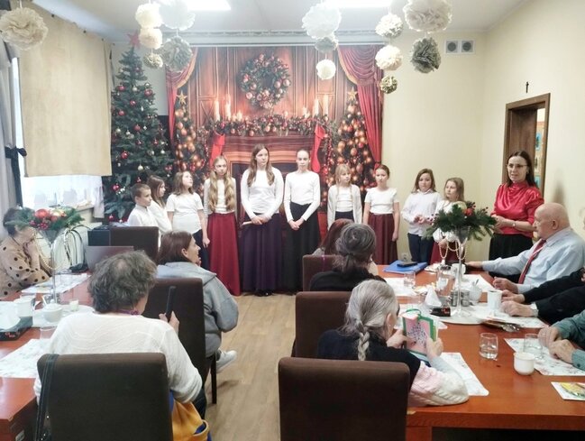 Uczniowie zaprezentowali piękne kolędy i pastorałki przy akompaniamencie, umilając czas naszym seniorom. Wspólne śpiewanie wprowadziło radosną, świąteczną atmosferę i wywołało wiele uśmiechów.