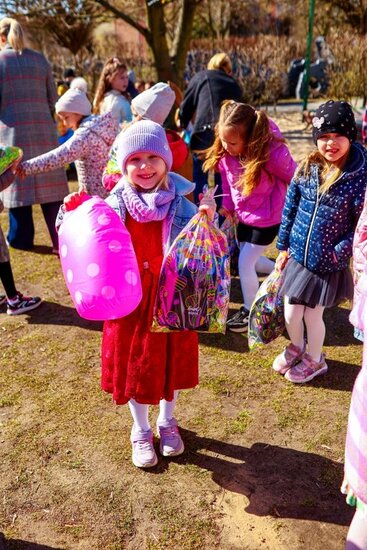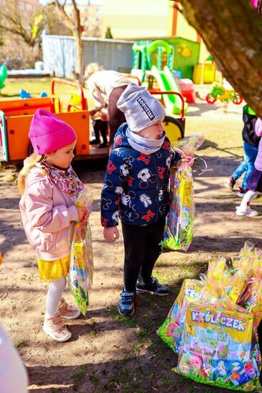 Jednak najwięcej emocji wzbudziła wizyta Zajączka Wielkanocnego, który ukrył dla dzieci prezenty w ogrodzie przedszkolnym. Przedszkolaki z wielkim entuzjazmem wyruszyły na ich poszukiwanie, a odnalezione upominki sprawiły im ogromną radość. Był to dzień pełen uśmiechu, zabawy i niezapomnianych chwil.
