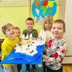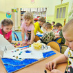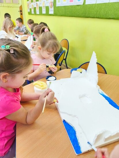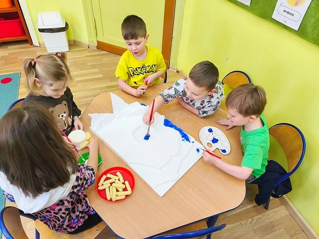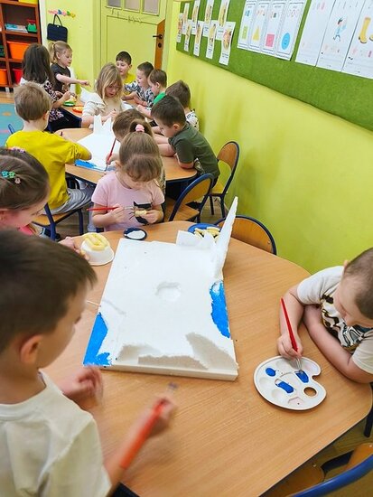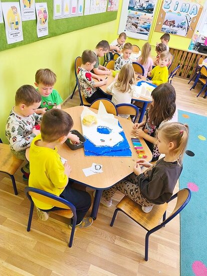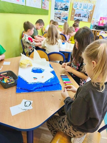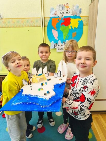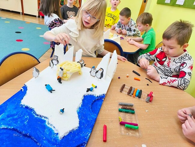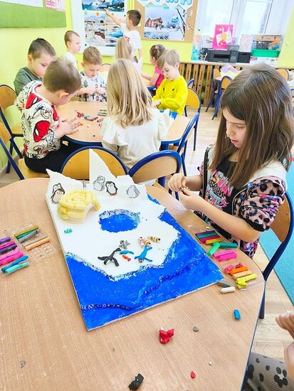 Dzieci z wielkim zaangażowaniem poznawały bieguny, ich klimat oraz niezwykłych mieszkańców. Efektem naszych zajęć była wspólna praca plastyczna – makieta przedstawiająca krainę wiecznego śniegu.