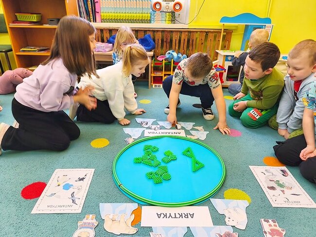 Dziś w Przedszkolu Miejskim# im. Ziemi Pałuckiej w Kcyni przenieśliśmy się w mroźny świat Arktyki i Antarktydy!