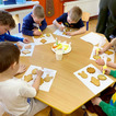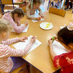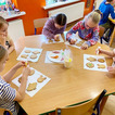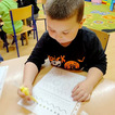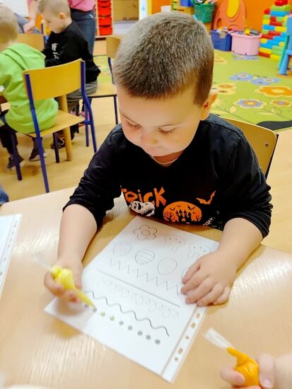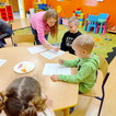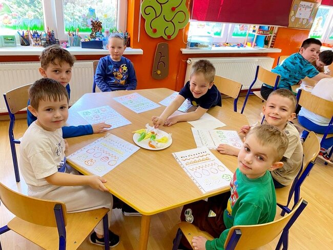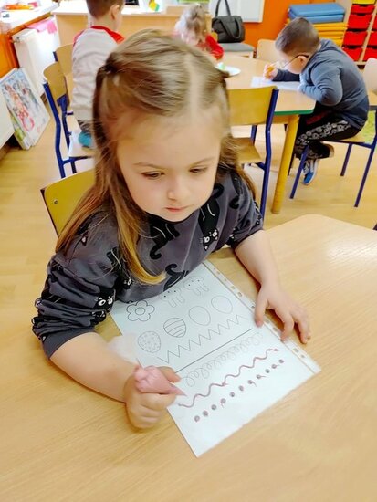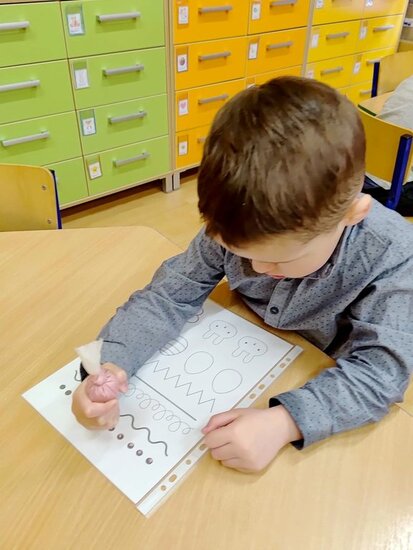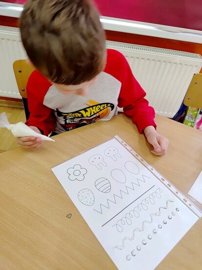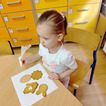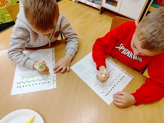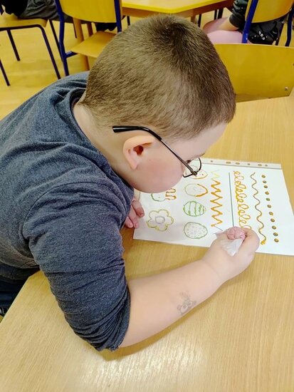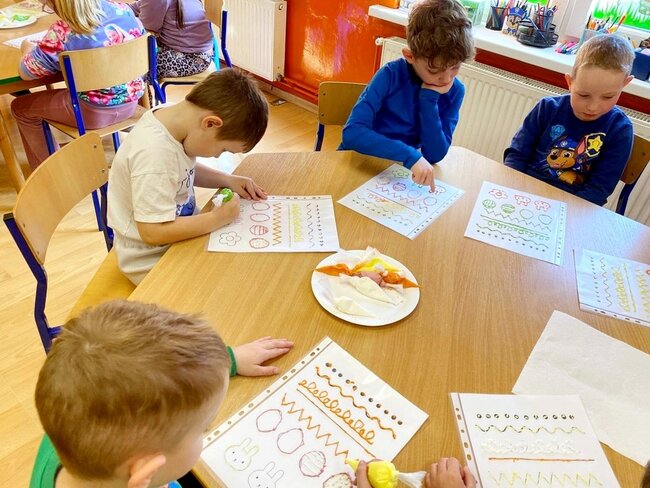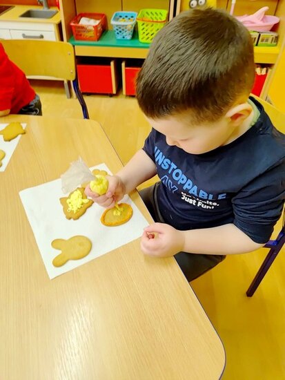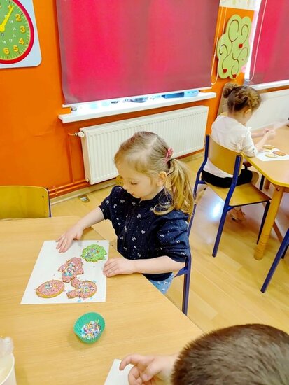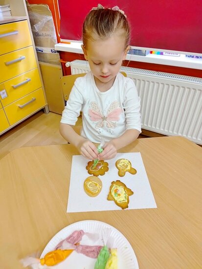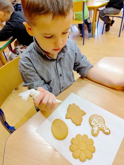 Z okazji zbliżających się Świąt Wielkanocnych przygotowała ciasteczka w kształcie jajka, kurki, zajaczka i kwiatka, które przedszkolaki miały dekorować lukrem i posypkami. Ale zanim zabrały się do dekorowania poznały tajniki pracy z lukrem królewskim, który musi być gęstszy niż ten do wypełnienia powierzchni i jak się go robi. A nie jest to takie proste. W tym celu na przygotowanych kartach próbowały pisać lukrem szlaczki. Zadanie to sprawiło naszym przedszkolakom dużo zabawy i pozwoliło rozwijać motorykę małą. Gdy już poćwiczyły różne wzorki zabrały się do dekorowania ciasteczek w wielkim skupieniu, a każde starało się, aby jego "dzieło sztuki" było jak najpiękniejsze i pomysłowe. Wszystkie ciasteczka wyglądały smakowicie. Po skończonej pracy słodkości zapakowały do pudełek, aby z nieskrywaną radością i dumą wręczyć je w domu swoim bliskim jako wielkanocną niespodziankę.