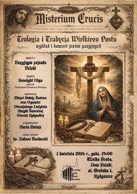 1 kwietnia 2026 r. (Wielka Środa), godz. 19:00#, Diecezjalny Instytut Muzyki Kościelnej w Bydgoszczy z radością zaprasza na wyjątkowe wydarzenie wielkopostne „Misterium Crucis”. „Ecce lignum Crucis, in quo salus mundi pependit: Venite adoremus” - Wieczór poświęcony teologii i tradycji Wielkiego Postu, łączący wykład oraz koncert pieśni pasyjnych.