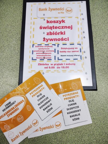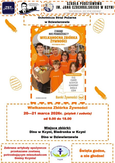 Drodzy Mieszkańcy! Wolontariusze Szkolnego Koła# Wolontariatu przy Zespole Szkół Technicznych w Kcyni, Szkoły im. ppor. Marka Uleryka w Dziewierzewie, Szkoły Podstawowej im. Jana Czochralskiego w Kcyni, Ochotnicza Straż Pożarna w Dziewierzewie oraz Miejsko-Gminny Ośrodek Pomocy Społecznej w Kcyni we współpracy z Pilskim Bankiem Żywności organizują Wielkanocną Zbiórkę Żywności 2026.