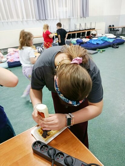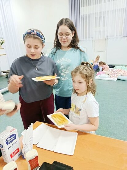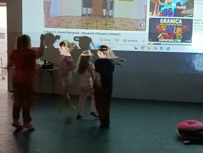 Podczas nocowanki dzieci miały okazję spędzić czas w radosnej i bezpiecznej atmosferze. W programie znalazły się wspólne zabawy, tańce oraz rozmowy integracyjne, które sprzyjały budowaniu relacji i wzmacnianiu więzi koleżeńskich. Nie zabrakło także wspólnego oglądania filmu, co stało się doskonałą okazją do odpoczynku po pełnym wrażeń dniu. Ogromną niespodzianką dla uczestników był słodki poczęstunek przekazany przez Sołtysa oraz Radę Sołecką wsi Dębowo, za który organizatorzy oraz dzieci składają serdeczne podziękowania. Dodatkowo panie z Centrum Kształcenia i Filii Bibliotecznej przygotowały dla dzieci pyszne, świeżo wypiekane gofry, które cieszyły się dużym zainteresowaniem i szybko znikały z talerzy. Zajęcia feryjne w świetlicy wiejskiej były doskonałą okazją do aktywnego i twórczego spędzenia wolnego czasu. Wspólna nocowanka przyniosła dzieciom wiele radości, uśmiechu oraz pozytywnych emocji, a także stała się pięknym przykładem integracji lokalnej społeczności.