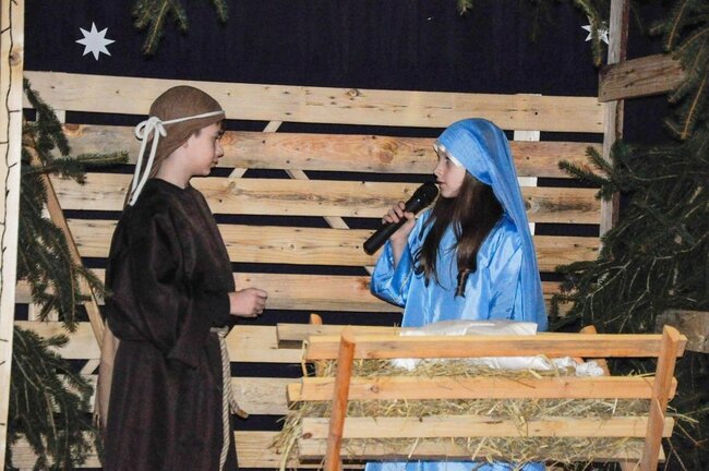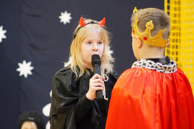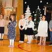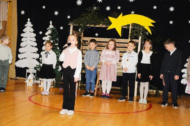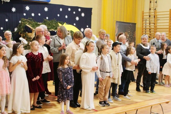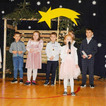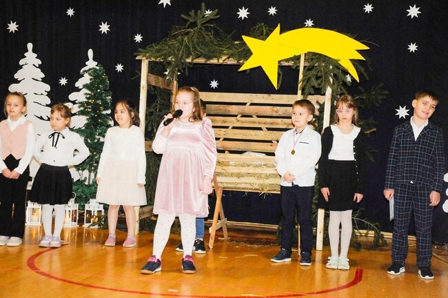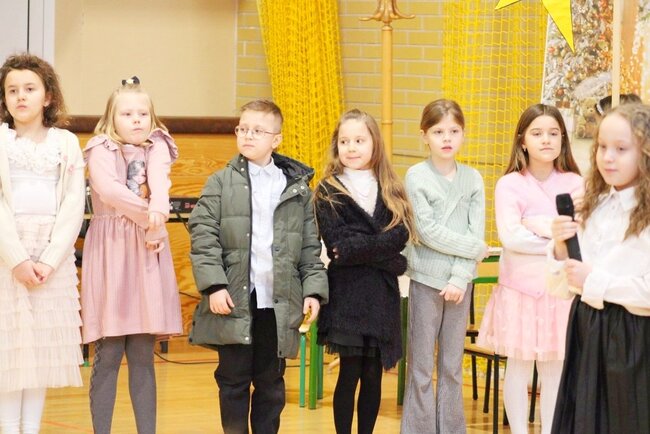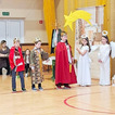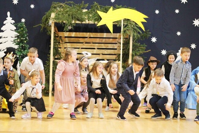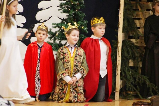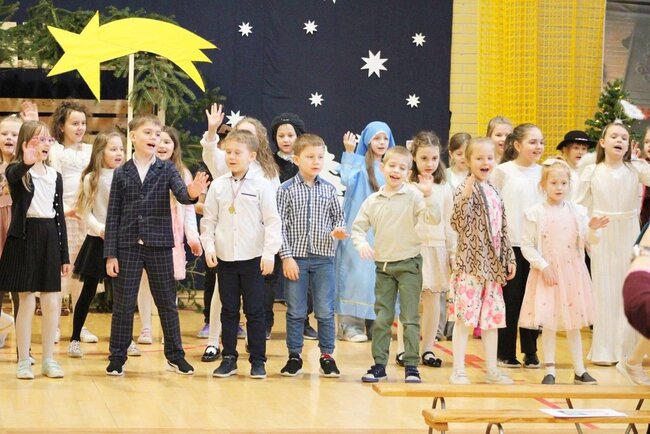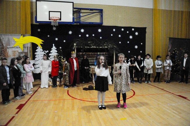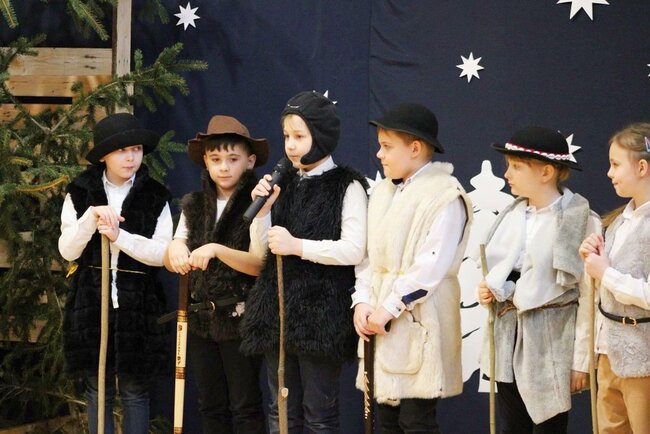 Następnie uczniowie klasy drugiej i trzeciej zaprezentowali jasełka, które w niezwykle ciekawy sposób łączyły świat współczesny ze scenami rozgrywającymi się w stajence przy małym Jezusie. Przedstawienie zachwyciło widzów zarówno treścią, jak i zaangażowaniem młodych aktorów.