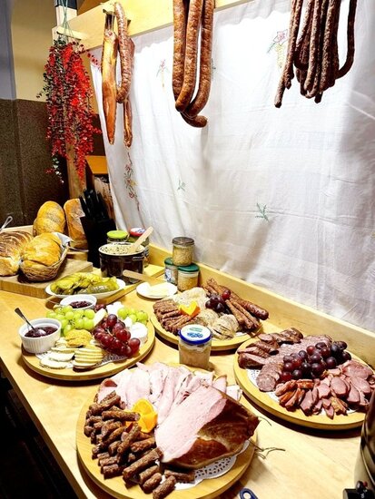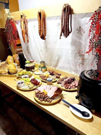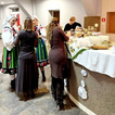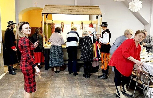 W klimacie ludowym, pełnym tradycyjnej kuchni, przygotowaliśmy poczęstunek dla wszystkich naszych gości. Na sali czekał już wiejski stół z bigosem, sałatką jarzynową, wędzonymi kiełbasami oraz szynką. Nie zabrakło smalcu, kiszonego ogórka i domowego chleba oraz oscypka z żurawiną. Na barze stało kilka rodzajów ciast, więc każdy mógł znaleść coś dla siebie. Tak jak barwne były stroje członków zespołu, tak wielobarwna była atmosfera tego wydarzenia. Wszystkim, którzy włożyli serce w ten wieczór, zarówno zespołowi jak i przybyłym gościom DZIĘKUJEMY.
