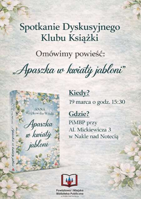 Zapraszamy na marcowe spotkanie #Dyskusyjnego Klubu Książki, podczas którego wspólnie porozmawiamy o powieści „Apaszka w kwiaty jabłoni” Anny Wojtkowskiej-Witali.