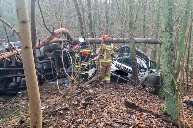 Zderzenie osobówki z ciężarówką. Kobieta i dziecko zabrane do szpitala