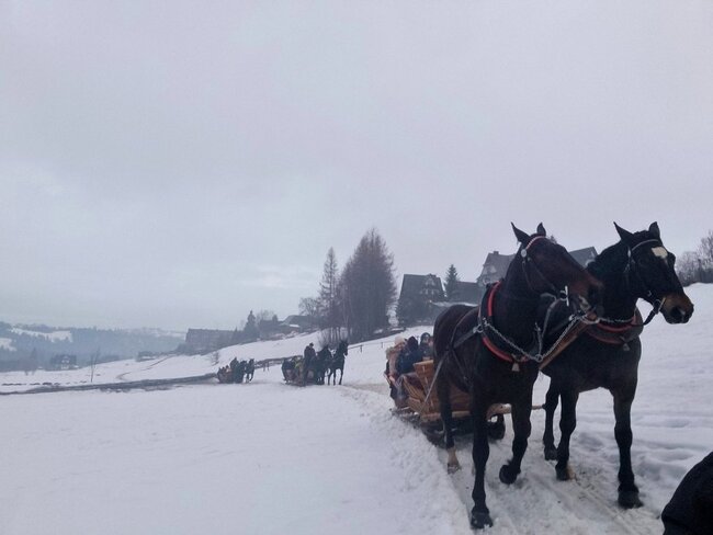 Nie zabrakło zimowych aktywności – jazdy na łyżwach i oponkach na torze lodowym. W czwartkowy wieczór uczestnicy świetnie bawili się na kuligu, który zakończył się wspólnym ogniskiem.