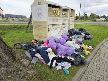 Trzeba robić zdjecia z numerami rejestracyjnymi osob ktore podrzucają smieci i zgłaszać na policję za zaśmiecanie. Mandat murowany. A w urzędzie miasta żądać usunięcia tych gównianych kontenerów z których nikt nie odbiera ciuchów.
