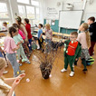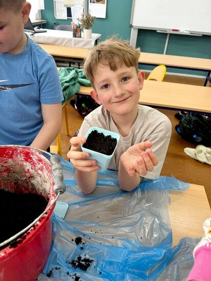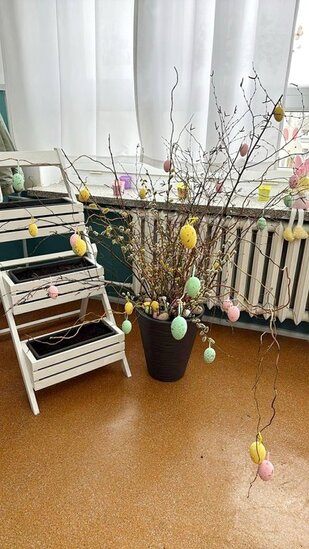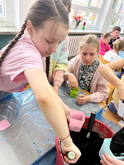 Uczniowie samodzielnie zasadzili już żonkile, obserwując ich wzrost i rozwój, a dziś wzbogacili klasowy kącik przyrodniczy o rzeżuchę. Dzięki temu mogą na bieżąco śledzić zmiany zachodzące w przyrodzie oraz uczyć się odpowiedzialności za rośliny. Dodatkowo dzieci przygotowały piękną dekorację do sali lekcyjnej, wykorzystując bazie kotki, gałązki oraz kolorowe jajka. Wspólna praca nad wystrojem klasy nie tylko rozwija ich kreatywność, ale także wprowadza radosny, wiosenny nastrój.