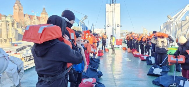 Uczniowie odbyli również wizytę w „Akademickim Centrum Szkoleniowym MUSTC” Politechniki Morskiej w Szczecinie. Mieli możliwość obserwacji profesjonalnego szkolenia i uczestniczyli w ćwiczeniach praktycznych, które pozwoliły im lepiej zrozumieć realia pracy na morzu. Zajęcia prowadzone były przez doświadczonych instruktorów, którzy dzielili się swoją wiedzą i doświadczeniem zawodowym.