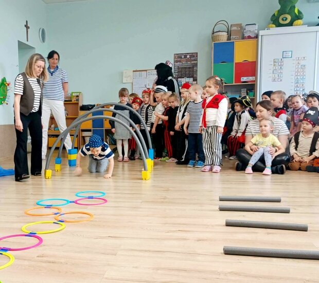 Następnie sprawnie uciekliśmy po kamieniach przed głodnymi krokodylami i odważnie przedarliśmy się przez niebezpieczną dżunglę. Nie zabrakło również wspólnego pirackiego tańca. Na koniec udało nam się przejść przez most linowy i po starciu ze strażnikiem zdobyliśmy upragniony skarb. W wielkim kufrze dzieci znalazły nowe gry dla swoich grup, złote monety oraz list, który specjalnie dla nich zostawiła Pani Wiosna.