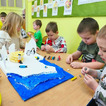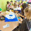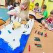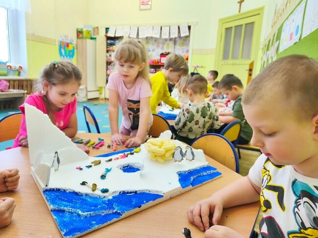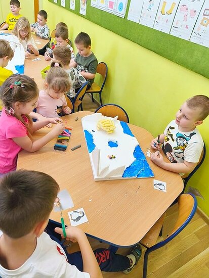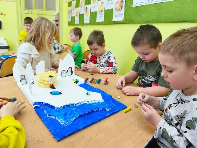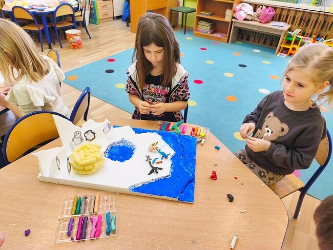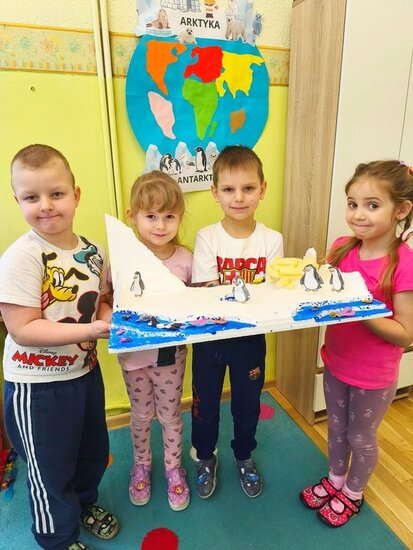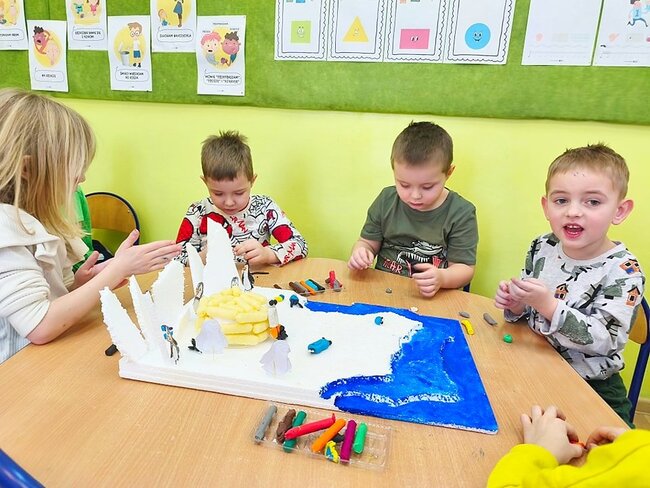 Dzieci z wielkim zaangażowaniem poznawały bieguny, ich klimat oraz niezwykłych mieszkańców. Efektem naszych zajęć była wspólna praca plastyczna – makieta przedstawiająca krainę wiecznego śniegu.
